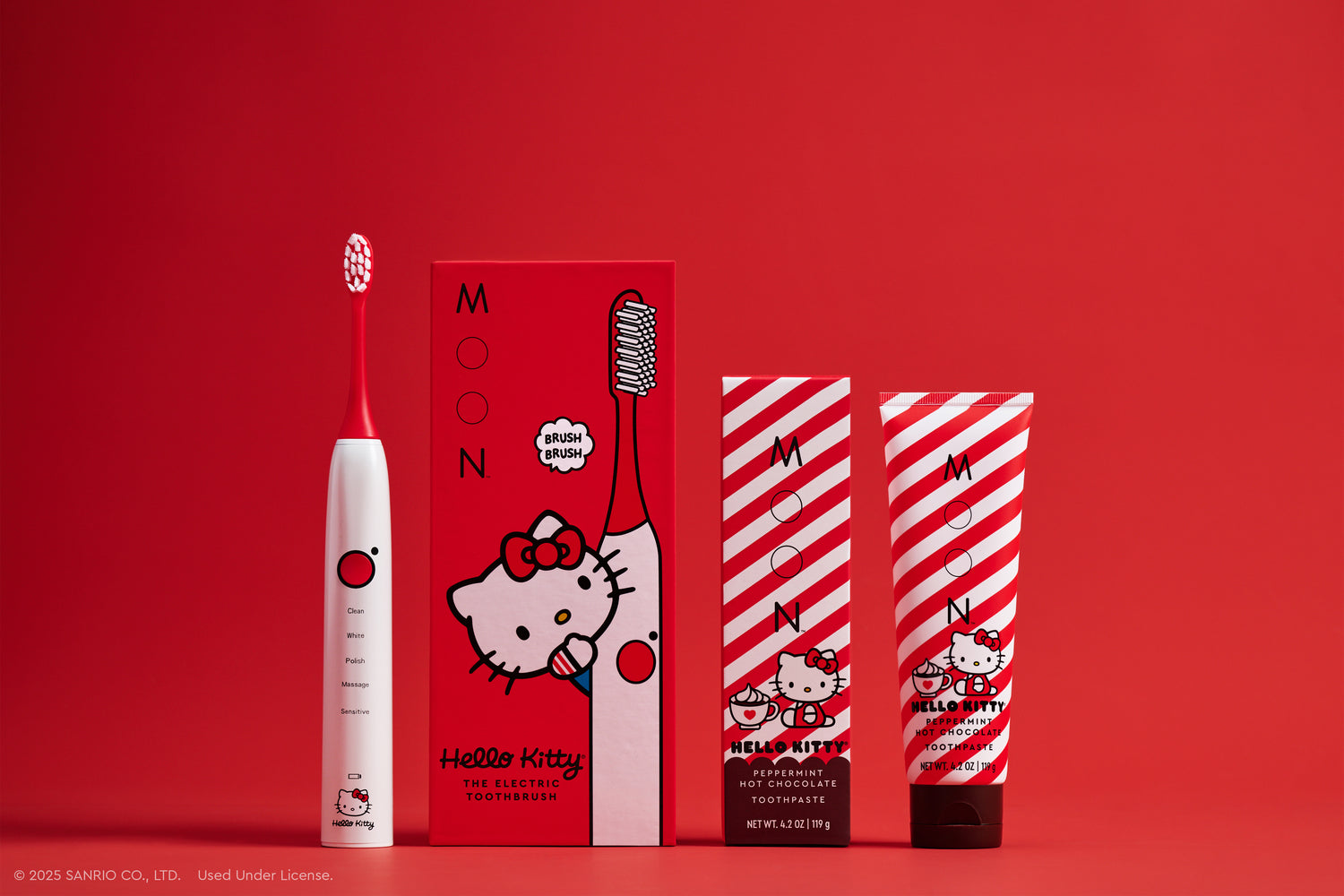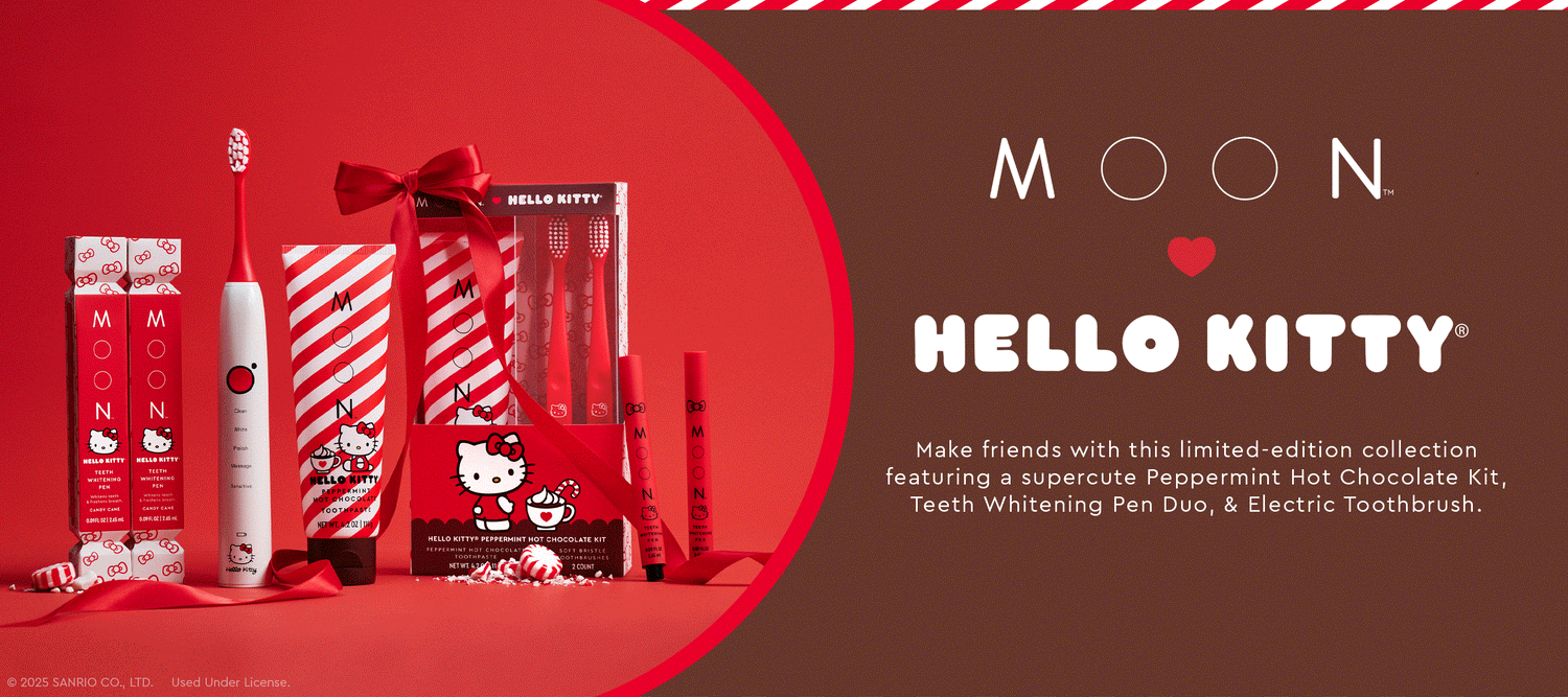 The limited-edition MOON x Hello Kitty® Peppermint Hot Chocolate Kit pairs two soft bristle toothbrushes with a sugar-free, fluoride-free Peppermint Hot Chocolate Toothpaste that’s as fun and festive as your favorite treat.