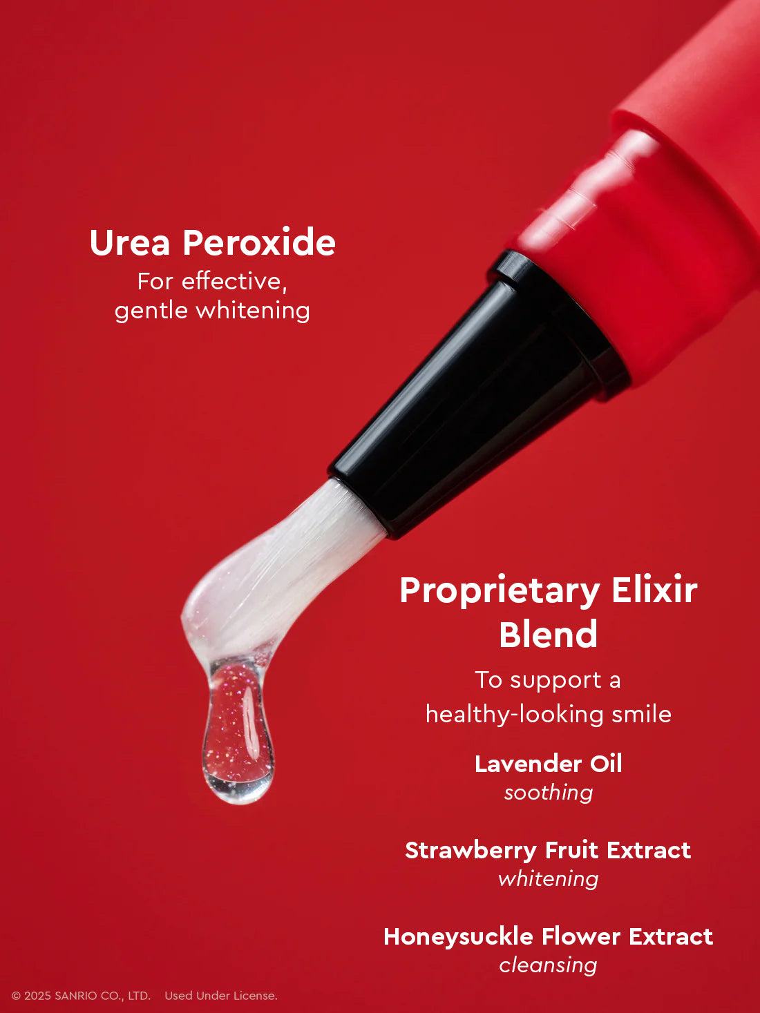 Two Teeth Whitening Pens featuring Hello Kitty®—packaged in a festive cracker-style kit, perfect for gifting or sharing. Gentle whitening formula with light-reflecting pigments for instant teeth brightening and urea peroxide for long-term whitening results with continued use.