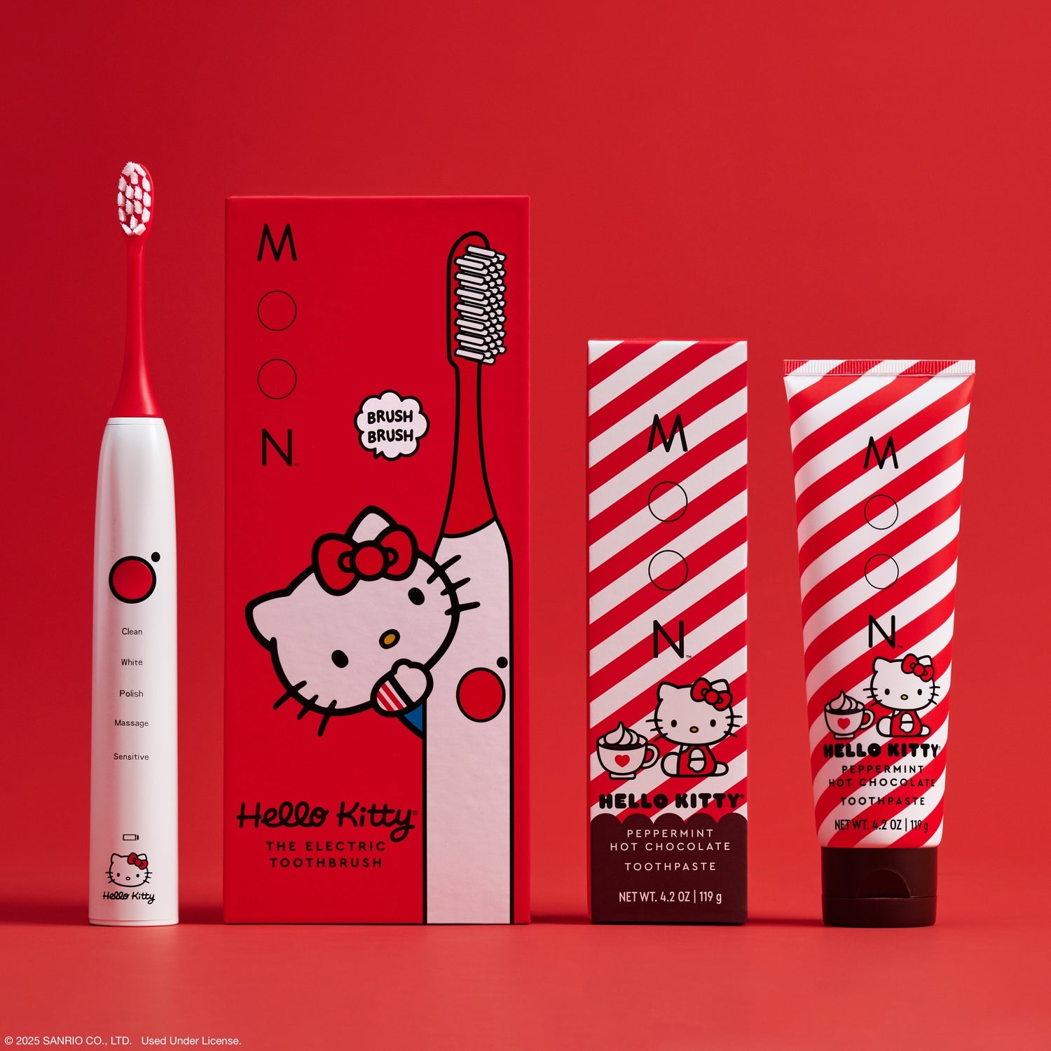 - Includes a fluoride-free MOON x Hello Kitty® Peppermint Hot Chocolate Toothpaste that blends refreshing peppermint with a cozy swirl of rich cocoa in a sugar-free formula. Features ethically-sourced mica to polish teeth and reduce surface stains, with a low-foam texture that makes brushing feel like a treat.